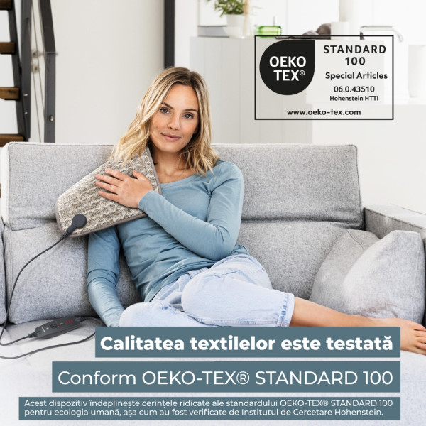 • Materialele textile utilizate pentru acest dispozitiv intrunesc strict cerințele ecologice ale OEKO-TEX ® 100 , după verificarea realizata de Hohenstein Research Institute.