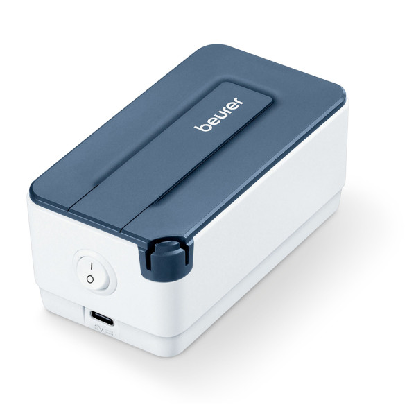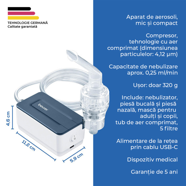 • Pachetul conține: aparat de aerosoli, atomizor, furtun de aer comprimat, piesă bucală, mască pentru adulți, mască pentru copii, piesă nazală, 5 filtre de schimb, cablu USB-C, instrucțiuni de utilizare